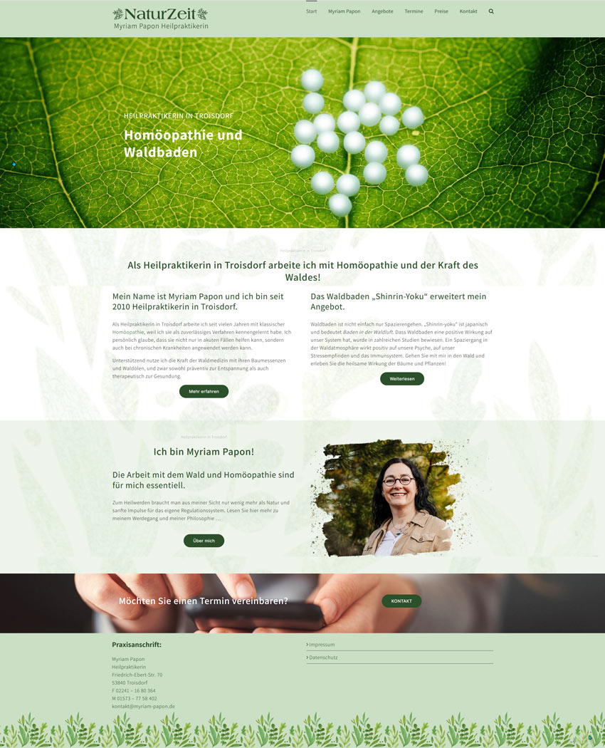 Im Herbst 2022 wendete sich Myriam Papon an mich, weil sie ihre Website erneuern lassen wollte. Sie bietet Homöopathie und Waldbaden. Das war ein schönes Projekt, weil auch ich den Wald sehr liebe und mich gut mit ihrem Angebot verbinden konnte.